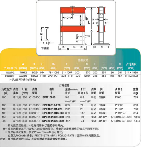 美国POWER TEAM100吨H型压床SPM10010、SPE10013DS1、油缸工作头利用滚轮可沿着上梁滑移,在做偏心压接工作时锁定于某一位置;利用用户提供的支撑腿,压床也能水平使用以适合特殊的应用场合。2、利用绞车,床身可升高或降低并可用床身固定插销加以锁定。上横梁可降低203 mm以适合重复性的工作。3、宽大的1067 x 1270 mm工作空间适应大工件操作,侧空立柱使杆状或轴状工件易于从侧面进入进行校正或弯曲。4、选用单作用或双作用油缸。可选液压泵包括:带7.6升油箱的双速手动泵,PE172电动液压泵或PQ系列低噪音“静音”电动液压泵。5、泵的电器参数 1)PE17 系列---0.37 KW, 220V, 50HZ,单相,也可提供115V,60Hz的型号,订购时请去掉后缀"-220"字样。2)PQ120 系列---2.24 kW, 380 V, 50 Hz, 三相。3)PQ60 系列---1.47kW,220V,50 Hz, 两相。