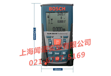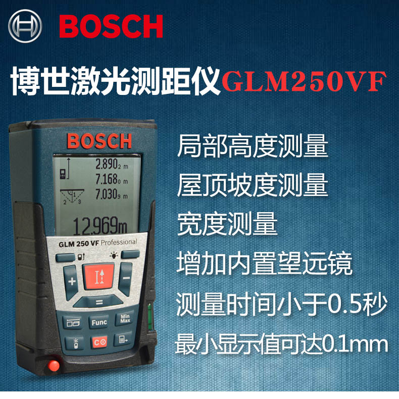博世BOSCH手持激光测距仪GLM250VF产品特点:1、内置望远镜,适合户外场所使用,可测量梯形长度;2、在测量范围内,无论测量环镜是否困难,皆能拥有比较好的准确性;3、最大距离可达250米;4、精度高达1mm;5、操作界面简单,方便使用;6、具测量距离、长度、高度、计算面积、体积等功能;7、可连续测量及记忆测量值30个数据;8、新增功能:2次勾股测量出间接高度和局部高度,梯形测量,线段放样,自动测量功能;9、自动省电装置;10、延长杆设计,可测量缝隙或角落等;11、带金属标准接口,可搭配三角架使用;12、选购配件:激光双目镜、接收板、望远镜景观。