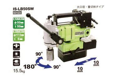 ISK-LB50ST|日本IKURA磁力钻|规格参数: 1.最大钻孔尺寸:Ø50mm,t50mm; 2.最小钻孔尺寸:Ø11.5,t6mm; 3.左右旋转:90°; 4.前后移动:10mm; 5.转速:350min; 6.功率:760W; 7.电源:220V AC; 8.磁性座尺寸:190x88mm; 9.最小吸附厚度:6mm; 10.最大吸附力:8.8KN; 11.尺寸(mm):192 x 356 x 300; 12.重量:10.5kg; 13.给油装置:电磁开关。